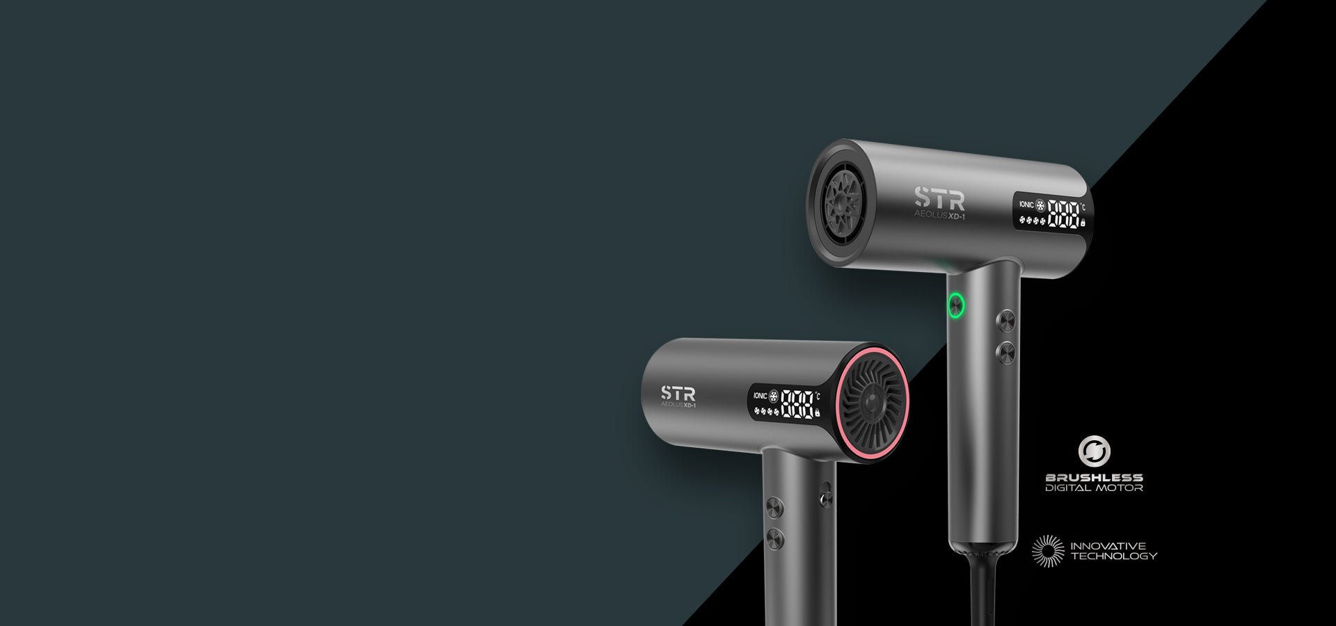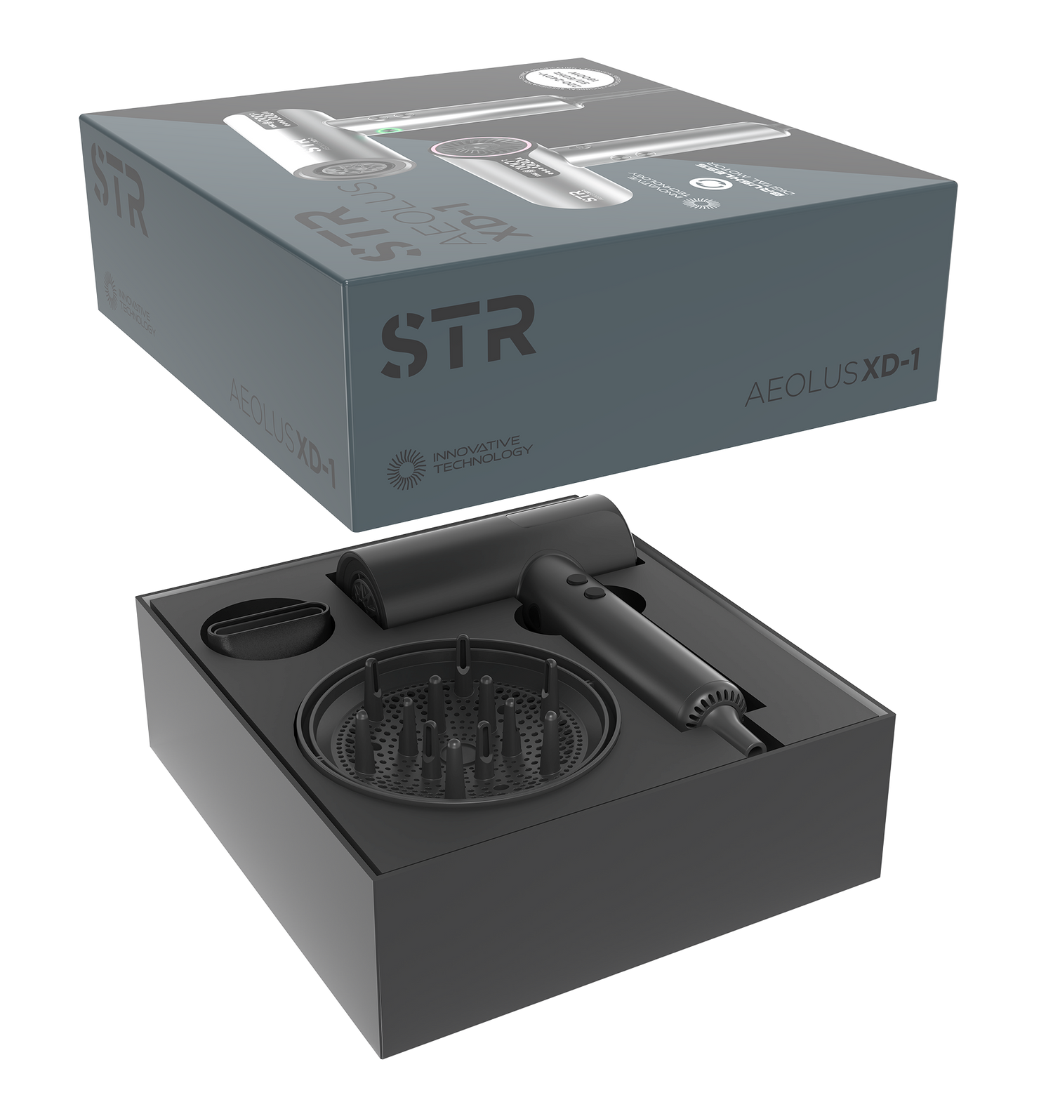The STR Aeolus XD1 Hairdryer combines a sleek black design with a powerful 1600W, 110,000 RPM motor for fast, professional drying.